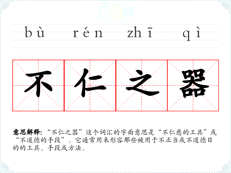 “不仁之器”这个词汇的字面意思是“不仁慈的工具”或“不道德的手段”。它通常用来形容那些被用于不正当或不道德目的的工具、手段或方法。