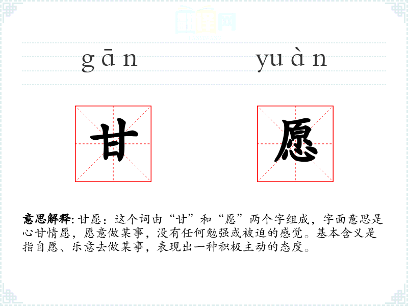 甘愿:这个词由“甘”和“愿”两个字组成,字面意思是心甘情愿,愿意做某事,没有任何勉强或被迫的感觉。基本含义是指自愿、乐意去做某事,表现出一种积极主动的态度。