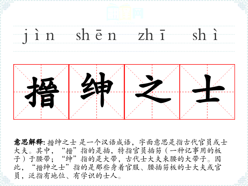 搢绅之士 是一个汉语成语,字面意思是指古代官员或士大夫。其中,“搢”指的是插,特指官员插笏(一种记事用的板子)于腰带;“绅”指的是大带,古代士大夫束腰的大带子。因此,“搢绅之士”指的是那些身着官服、腰插笏板的士大夫或官员,泛指有地位、有学识的士人。