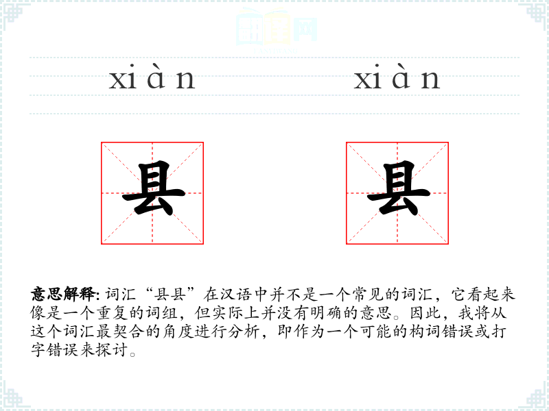 词汇“县县”在汉语中并不是一个常见的词汇,它看起来像是一个重复的词组,但实际上并没有明确的意思。因此,我将从这个词汇最契合的角度进行分析,即作为一个可能的构词错误或打字错误来探讨。