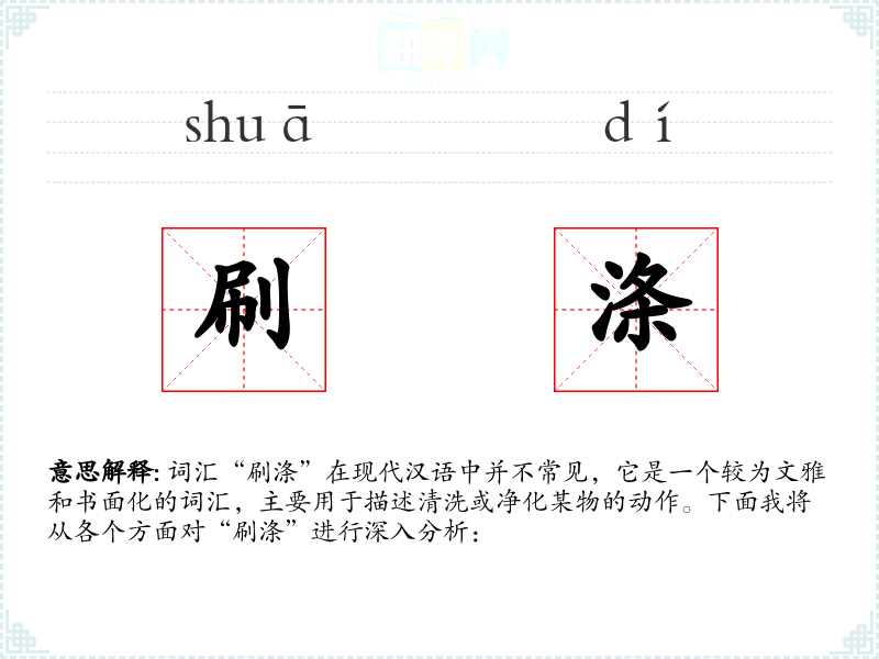 词汇“刷涤”在现代汉语中并不常见,它是一个较为文雅和书面化的词汇,主要用于描述清洗或净化某物的动作。下面我将从各个方面对“刷涤”进行深入分析: