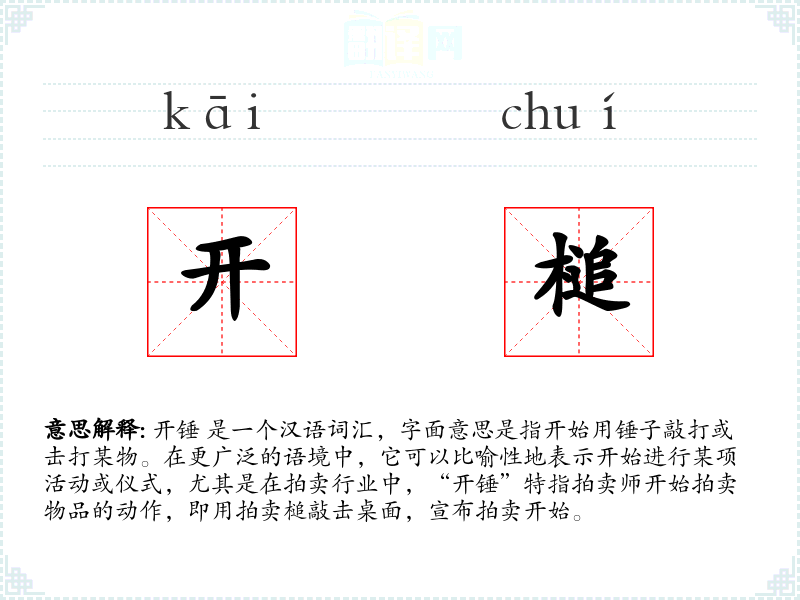 - 专业领域:在拍卖行业,“开锤”是专业术语,指拍卖师正式开始拍卖的过程。