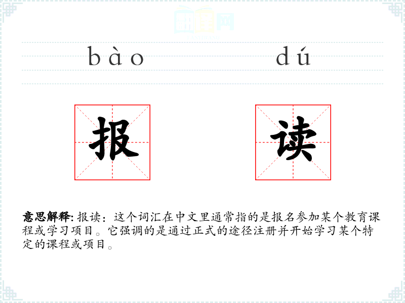 报读:这个词汇在中文里通常指的是报名参加某个教育课程或学项目。它强调的是通过正式的途径注册并开始学某个特定的课程或项目。