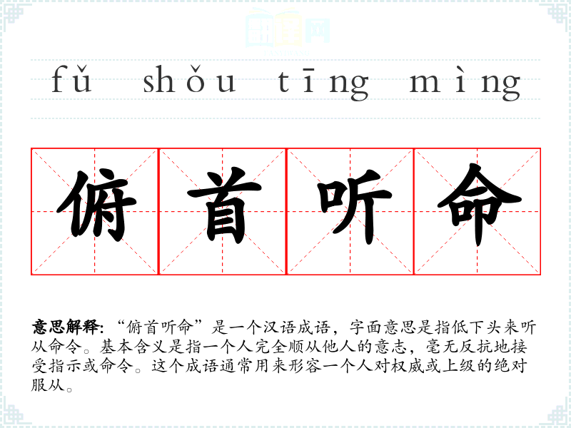 “俯首听命”是一个汉语成语,字面意思是指低下头来听从命令。基本含义是指一个人完全顺从他人的意志,毫无反抗地接受指示或命令。这个成语通常用来形容一个人对权威或上级的绝对服从。