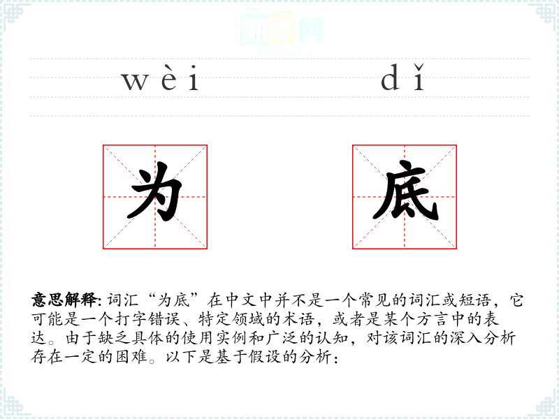 如果“为底”是一个打字错误,它可能原本是想表达“为底色”、“为底层”或“为底线”等意思。如果是特定领域的术语,可能需要具体到该领域才能准确解释。