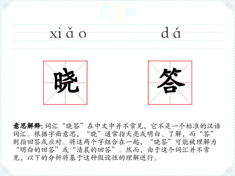词汇“晓答”在中文中并不常见,它不是一个标准的汉语词汇。根据字面意思,“晓”通常指天亮或明白、了解,而“答”则指回答或应对。将这两个字组合在一起,“晓答”可能被理解为“明白的回答”或“清晨的回答”。然而,由于这个词汇并不常见,以下的分析将基于这种假设性的理解进行。