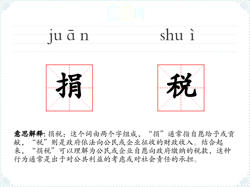 捐税:这个词由两个字组成,“捐”通常指自愿给予或贡献,“税”则是政府依法向公民或企业征收的财政收入。结合起来,“捐税”可以理解为公民或企业自愿向政府缴纳的税款,这种行为通常是出于对公共利益的考虑或对社会责任的承担。