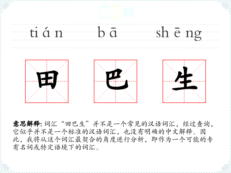 词汇“田巴生”并不是一个常见的汉语词汇,经过查询,它似乎并不是一个标准的汉语词汇,也没有明确的中文解释。因此,我将从这个词汇最契合的角度进行分析,即作为一个可能的专有名词或特定语境下的词汇。