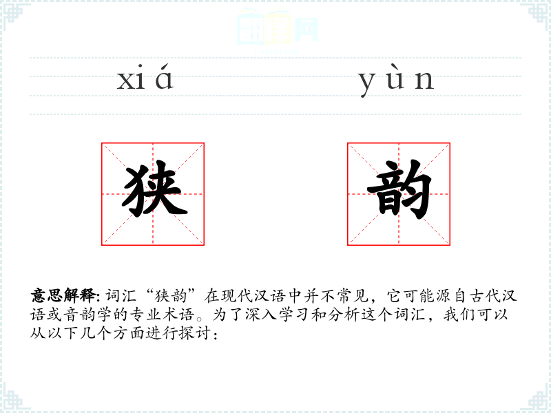 词汇“狭韵”在现代汉语中并不常见,它可能源自古代汉语或音韵学的专业术语。为了深入学*和分析这个词汇,我们可以从以下几个方面进行探讨: