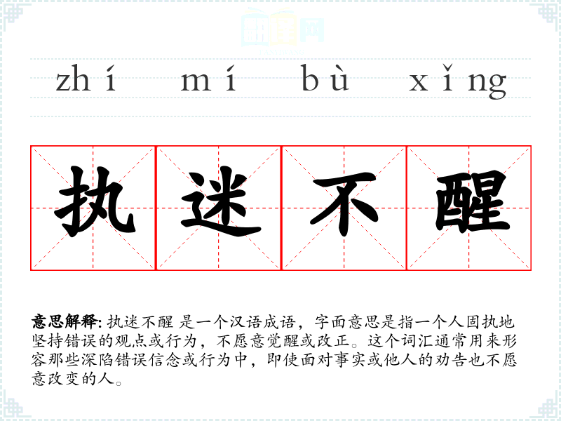 执迷不醒 是一个汉语成语,字面意思是指一个人固执地坚持错误的观点或行为,不愿意觉醒或改正。这个词汇通常用来形容那些深陷错误信念或行为中,即使面对事实或他人的劝告也不愿意改变的人。