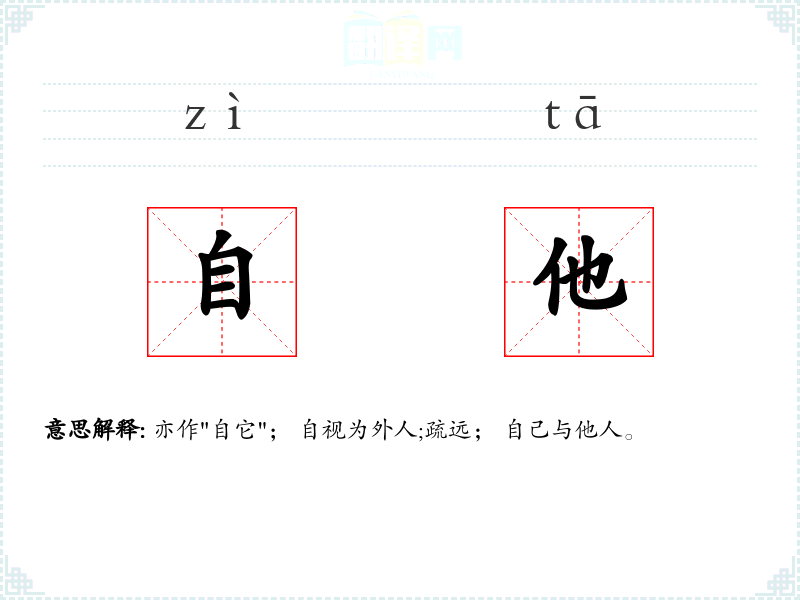亦作"自它"; 自视为外人;疏远; 自己与他人。