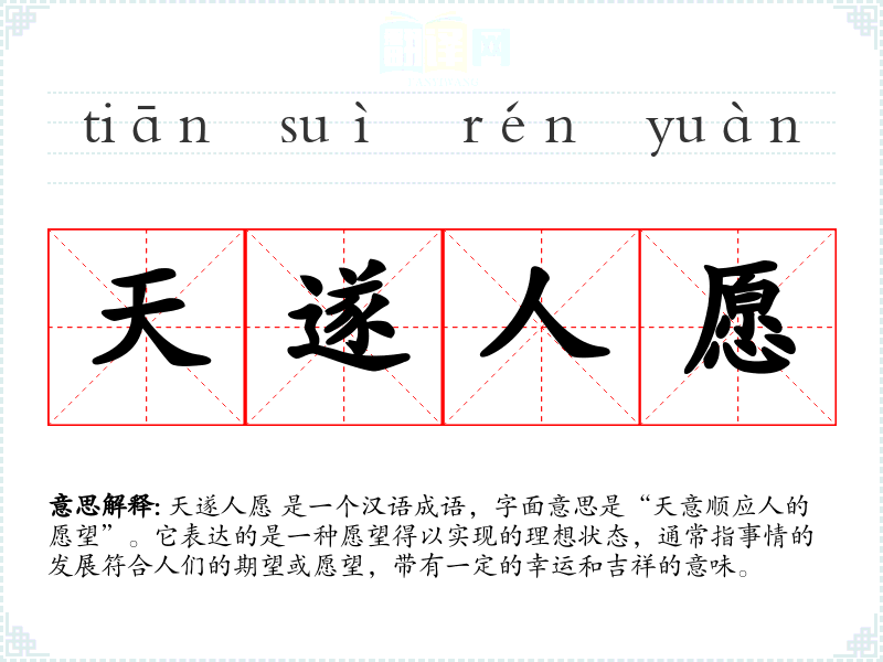 在文化中,天遂人愿** 常常与吉祥、好运联系在一起。它反映了人们对美好生活的向往和对命运的积极态度。在社会交往中,这个成语也常用来表达对他人的美好祝愿。