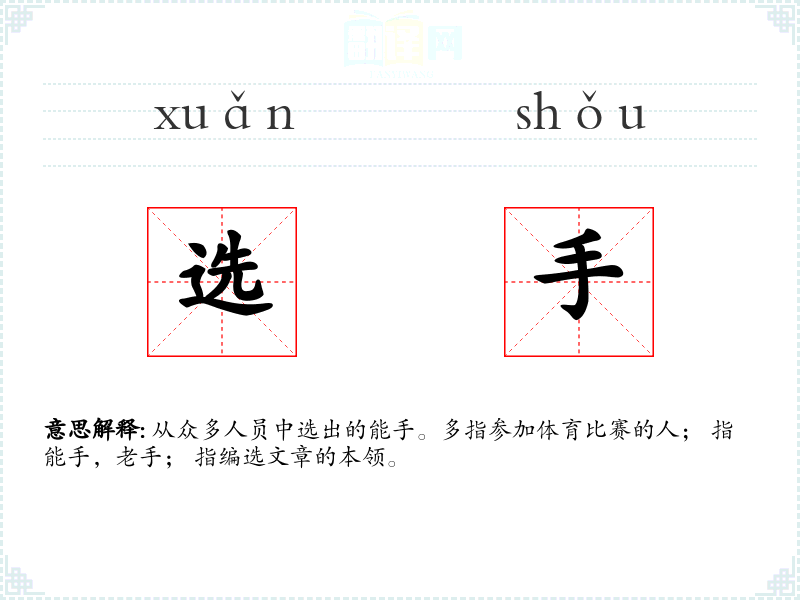 从众多人员中选出的能手。多指参加体育比赛的人; 指能手,老手; 指编选文章的本领。