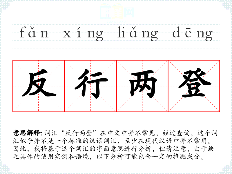 词汇“反行两登”在中文中并不常见,经过查询,这个词汇似乎并不是一个标准的汉语词汇,至少在现代汉语中并不常用。因此,我将基于这个词汇的字面意思进行分析,但请注意,由于缺乏具体的使用实例和语境,以下分析可能包含一定的推测成分。
