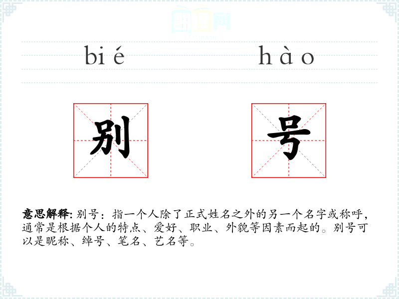 别号:指一个人除了正式姓名之外的另一个名字或称呼,通常是根据个人的特点、爱好、职业、外貌等因素而起的。别号可以是昵称、绰号、笔名、艺名等。