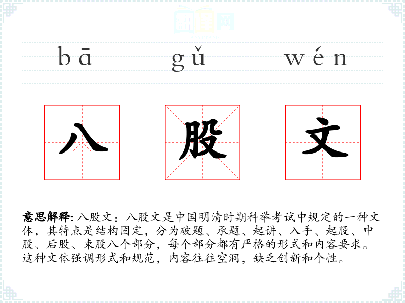 八股文的名称来源于其固定的八个部分。这种文体起源于宋代,成熟于明清时期,是科举考试的主要文体。随着科举制度的废除,八股文逐渐退出了历史舞台,但其影响在现代汉语中依然存在,尤其是在批判僵化思维和形式主义时。