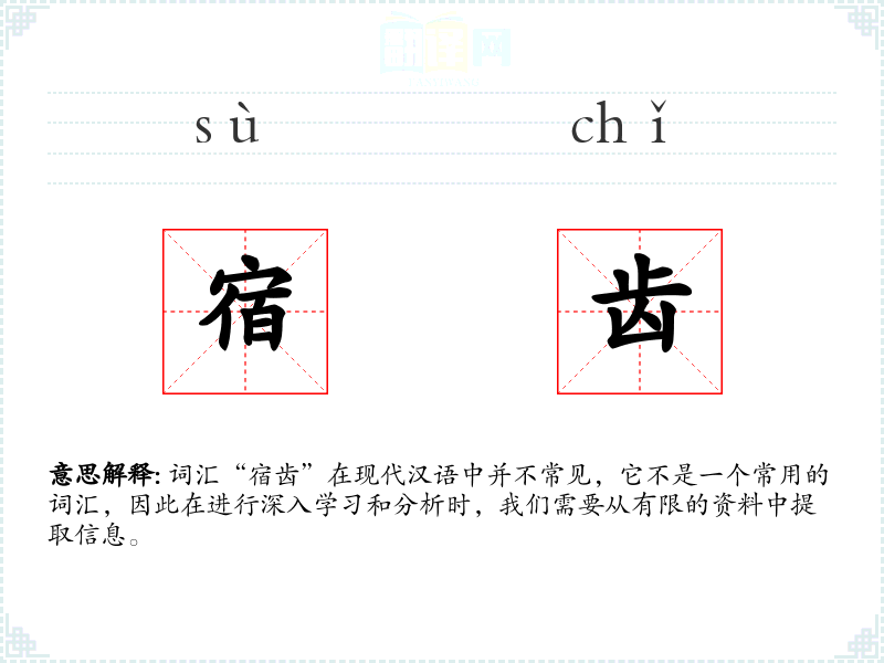 词汇“宿齿”在现代汉语中并不常见,它不是一个常用的词汇,因此在进行深入学*和分析时,我们需要从有限的资料中提取信息。