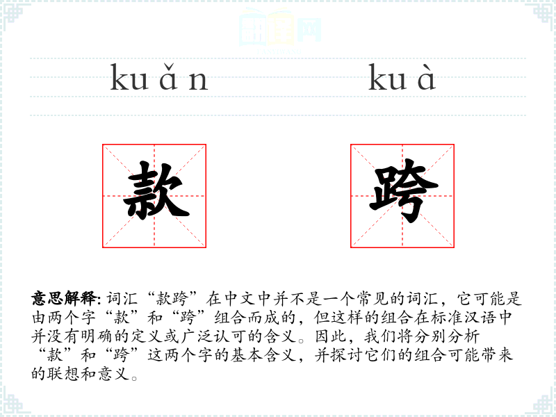 词汇“款跨”在中文中并不是一个常见的词汇,它可能是由两个字“款”和“跨”组合而成的,但这样的组合在标准汉语中并没有明确的定义或广泛认可的含义。因此,我们将分别分析“款”和“跨”这两个字的基本含义,并探讨它们的组合可能带来的联想和意义。