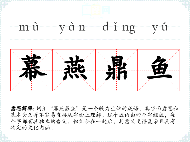 词汇“幕燕鼎鱼”是一个较为生僻的成语,其字面意思和基本含义并不容易直接从字面上理解。这个成语由四个字组成,每个字都有其独立的含义,但组合在一起后,其意义变得复杂且具有特定的文化内涵。