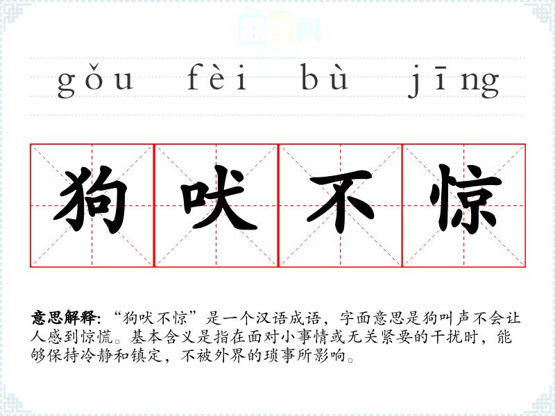 “狗吠不惊”是一个汉语成语,字面意思是狗叫声不会让人感到惊慌。基本含义是指在面对小事情或无关紧要的干扰时,能够保持冷静和镇定,不被外界的琐事所影响。