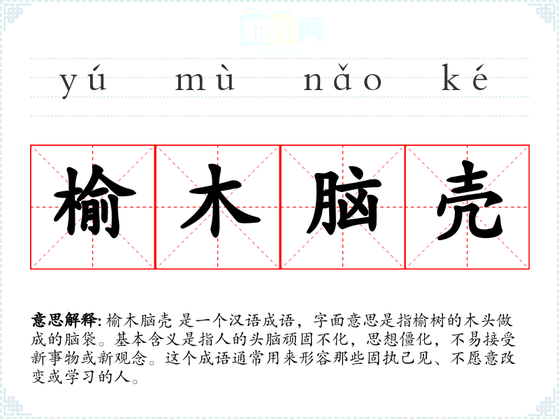 榆木脑壳 是一个汉语成语,字面意思是指榆树的木头做成的脑袋。基本含义是指人的头脑顽固不化,思想僵化,不易接受新事物或新观念。这个成语通常用来形容那些固执己见、不愿意改变或学*的人。