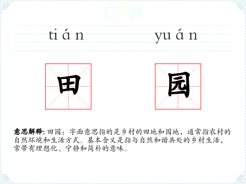 田园:字面意思指的是乡村的田地和园地,通常指农村的自然环境和生活方式。基本含义是指与自然和谐共处的乡村生活,常带有理想化、宁静和简朴的意味。