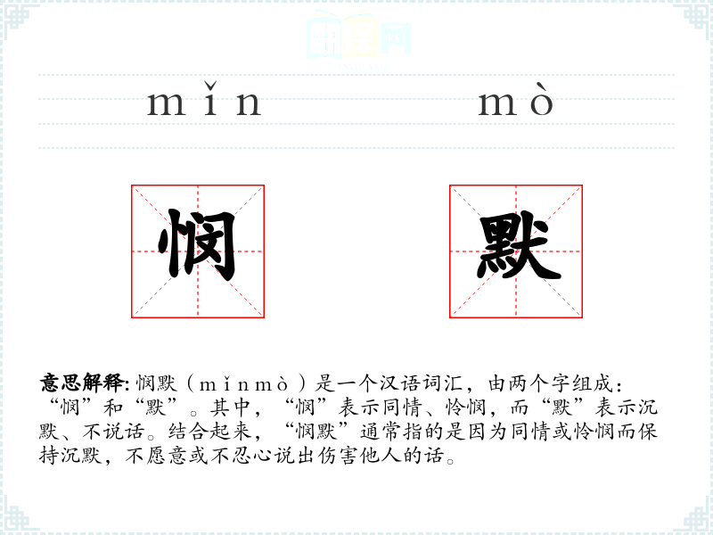 悯默(mǐn mò)是一个汉语词汇,由两个字组成:“悯”和“默”。其中,“悯”表示同情、怜悯,而“默”表示沉默、不说话。结合起来,“悯默”通常指的是因为同情或怜悯而保持沉默,不愿意或不忍心说出伤害他人的话。