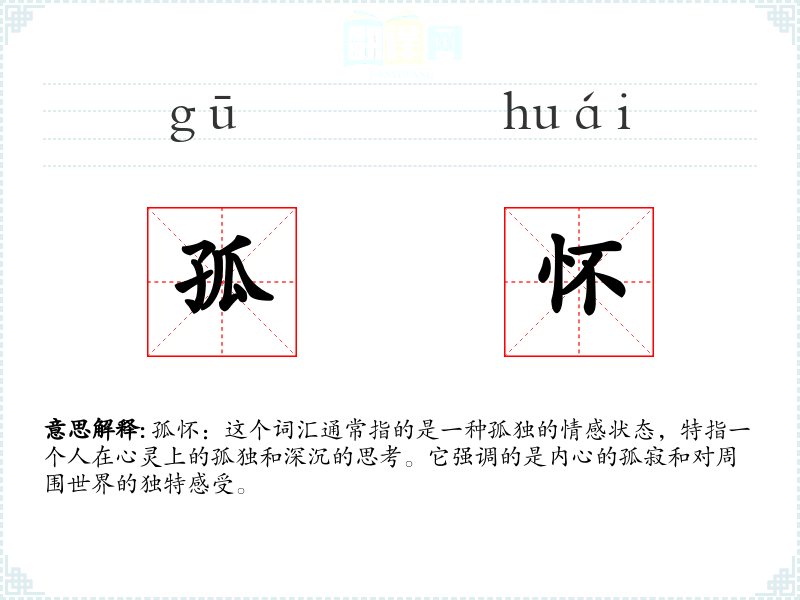 孤怀:这个词汇通常指的是一种孤独的情感状态,特指一个人在心灵上的孤独和深沉的思考。它强调的是内心的孤寂和对周围世界的独特感受。