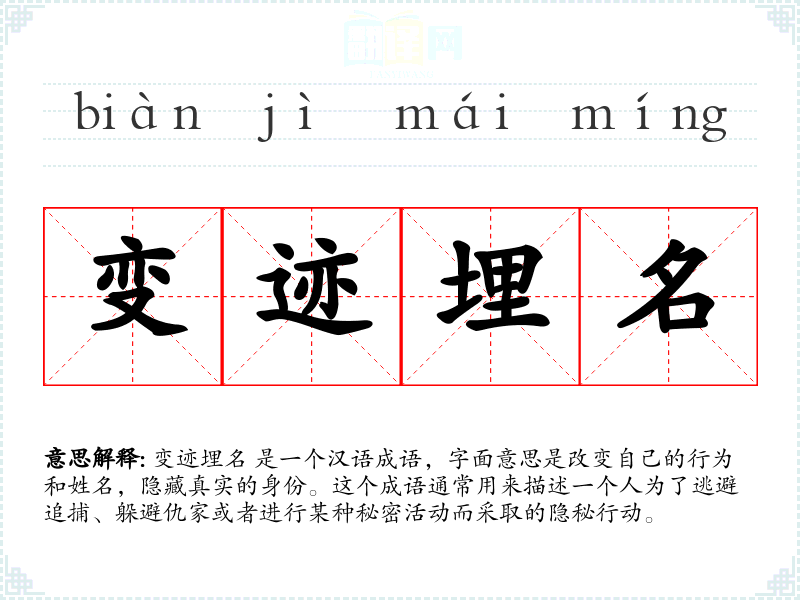 变迹埋名 是一个汉语成语,字面意思是改变自己的行为和姓名,隐藏真实的身份。这个成语通常用来描述一个人为了逃避追捕、躲避仇家或者进行某种秘密活动而采取的隐秘行动。