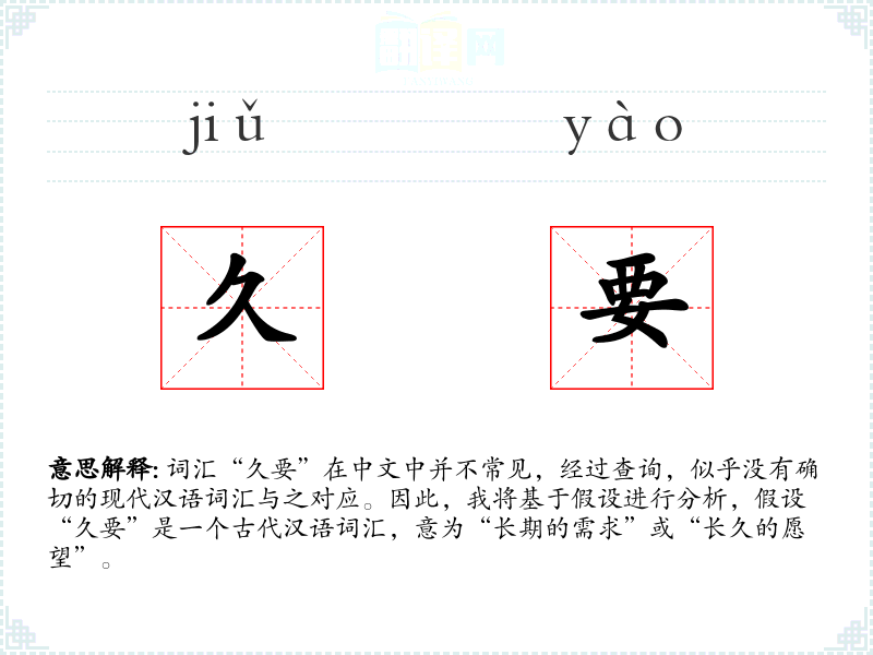 词汇“久要”在中文中并不常见,经过查询,似乎没有确切的现代汉语词汇与之对应。因此,我将基于假设进行分析,假设“久要”是一个古代汉语词汇,意为“长期的需求”或“长久的愿望”。