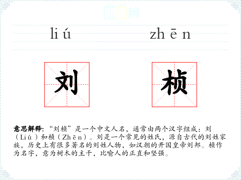 “刘桢”是一个中文人名,通常由两个汉字组成:刘(Liú)和桢(Zhēn)。刘是一个常见的姓氏,源自古代的刘姓家族,历史上有很多著名的刘姓人物,如汉朝的开国**刘邦。桢作为名字,意为树木的主干,比喻人的正直和坚强。