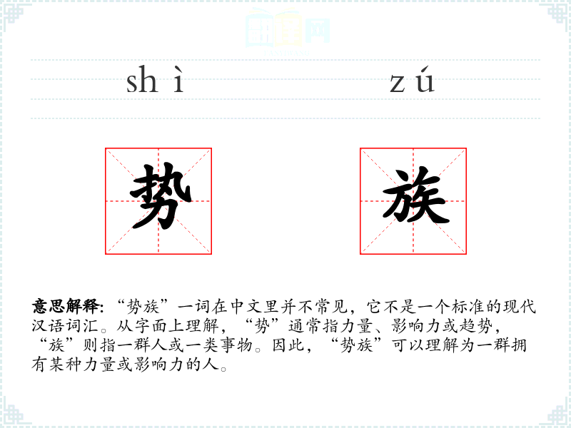 “势族”一词在中文里并不常见,它不是一个标准的现代汉语词汇。从字面上理解,“势”通常指力量、影响力或趋势,“族”则指一群人或一类事物。因此,“势族”可以理解为一群拥有某种力量或影响力的人。