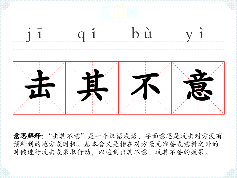 - 同义词:出其不意、攻其不备、突袭、偷袭