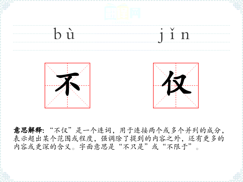 “不仅”是一个连词,用于连接两个或多个并列的成分,表示超出某个范围或程度,强调除了提到的内容之外,还有更多的内容或更深的含义。字面意思是“不只是”或“不限于”。