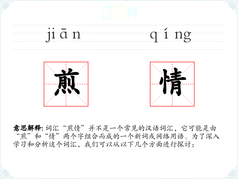 词汇“煎情”并不是一个常见的汉语词汇,它可能是由“煎”和“情”两个字组合而成的一个新词或网络用语。为了深入学习和分析这个词汇,我们可以从以下几个方面进行探讨: