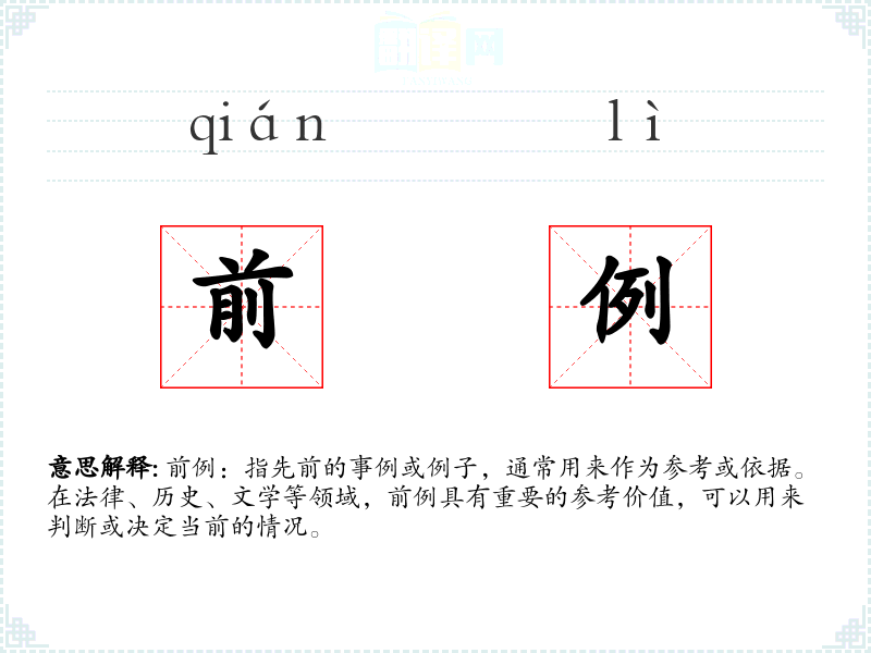前例:指先前的事例或例子,通常用来作为参考或依据。在法律、历史、文学等领域,前例具有重要的参考价值,可以用来判断或决定当前的情况。