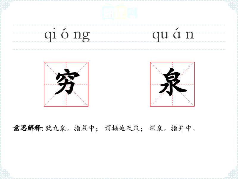 犹九泉。指墓中; 谓掘地及泉; 深泉。指井中。