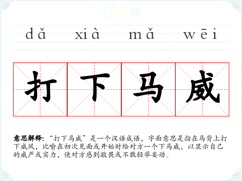 “打下马威”是一个汉语成语,字面意思是指在马背上打下威风,比喻在初次见面或开始时给对方一个下马威,以显示自己的威严或实力,使对方感到敬畏或不敢轻举妄动。