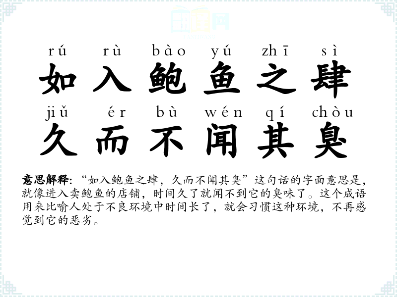 - rú rù bào yú zhī sì,jiǔ ér bù wén qí chòu如入鲍鱼之肆,久而不闻其臭