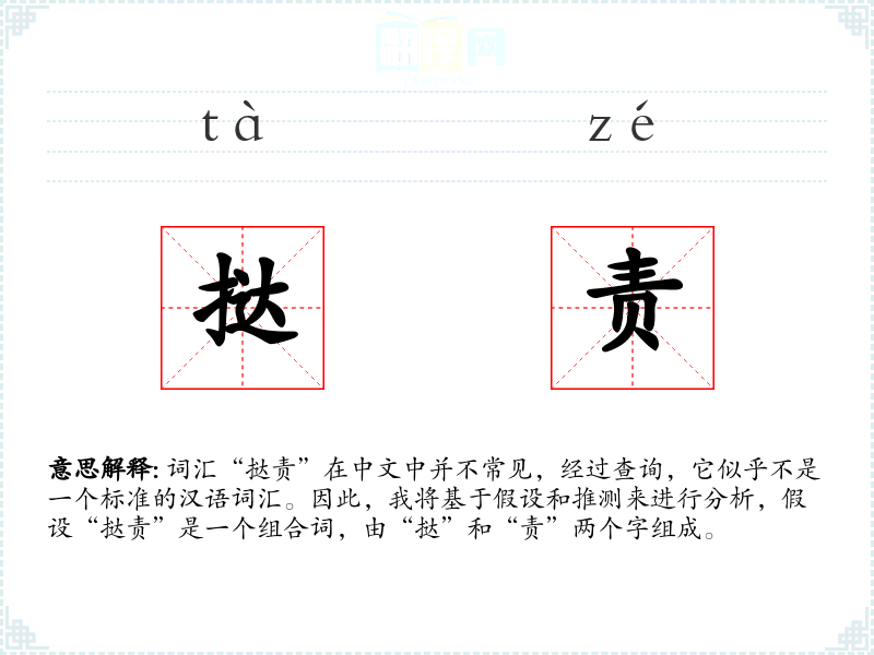 词汇“挞责”在中文中并不常见,经过查询,它似乎不是一个标准的汉语词汇。因此,我将基于假设和推测来进行分析,假设“挞责”是一个组合词,由“挞”和“责”两个字组成。