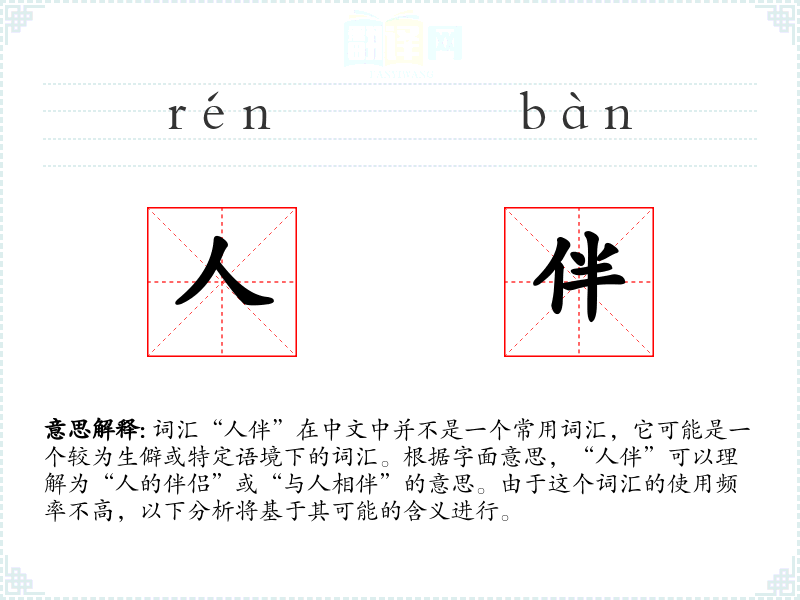 词汇“人伴”在中文中并不是一个常用词汇,它可能是一个较为生僻或特定语境下的词汇。根据字面意思,“人伴”可以理解为“人的伴侣”或“与人相伴”的意思。由于这个词汇的使用频率不高,以下分析将基于其可能的含义进行。