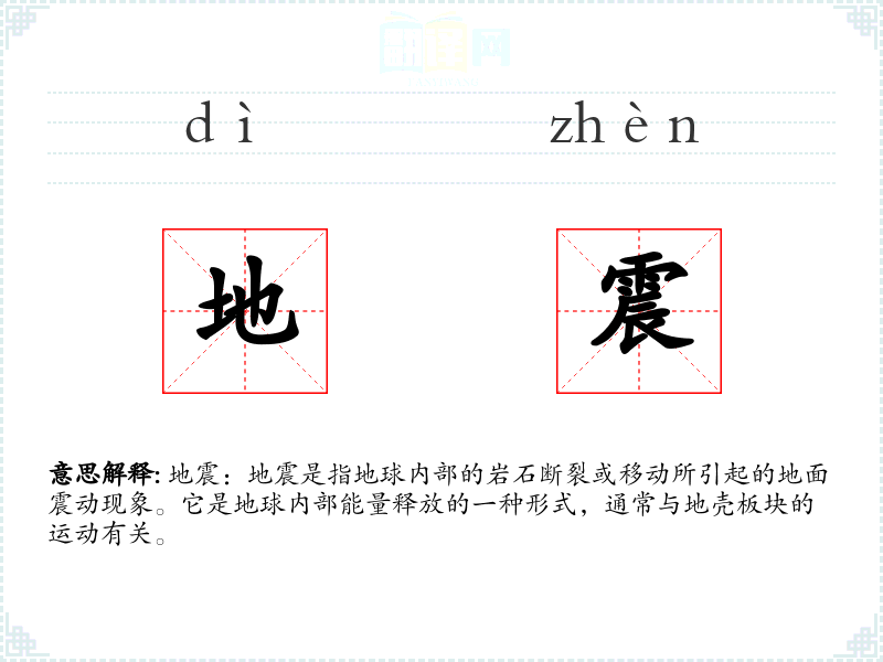 - 词源:地震一词源自汉语,由“地”和“震”组成,字面意思即地面震动。