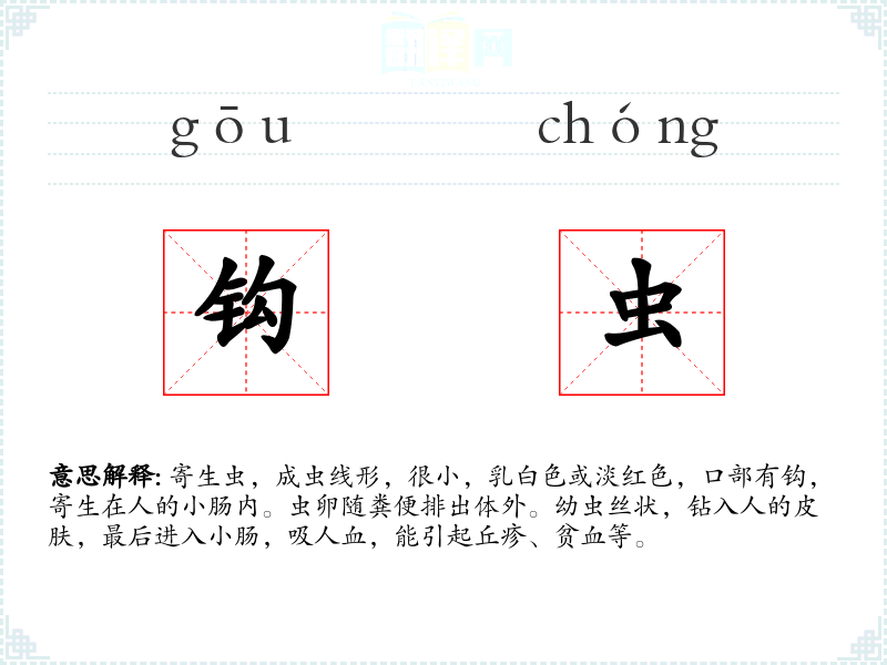 ,成虫线形,很小,乳白色或淡红色,口部有钩,寄生在人的小肠内。虫卵随粪便排出体外。幼虫丝状,钻入人的皮肤,最后进入小肠,吸人血,能引起丘疹、贫血等。