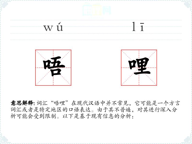 词汇“唔哩”在现代汉语中并不常见,它可能是一个方言词汇或者是特定地区的口语表达。由于其不普遍,对其进行深入分析可能会受到限制。以下是基于现有信息的分析: