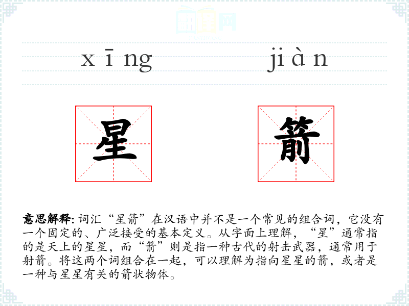 词汇“星箭”在汉语中并不是一个常见的组合词,它没有一个固定的、广泛接受的基本定义。从字面上理解,“星”通常指的是天上的星星,而“箭”则是指一种古代的射击武器,通常用于射箭。将这两个词组合在一起,可以理解为指向星星的箭,或者是一种与星星有关的箭状物体。