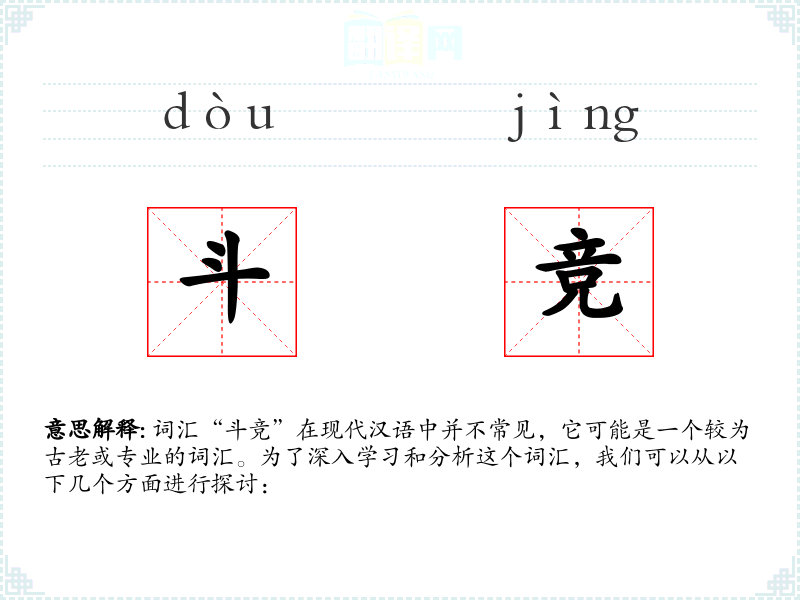 词汇“斗竞”在现代汉语中并不常见,它可能是一个较为古老或专业的词汇。为了深入学*和分析这个词汇,我们可以从以下几个方面进行探讨: