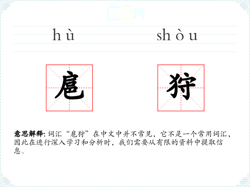 词汇“扈狩”在中文中并不常见,它不是一个常用词汇,因此在进行深入学*和分析时,我们需要从有限的资料中提取信息。