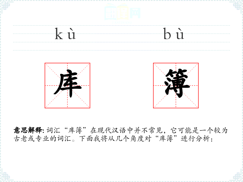 词汇“库簿”在现代汉语中并不常见,它可能是一个较为古老或专业的词汇。下面我将从几个角度对“库簿”进行分析: