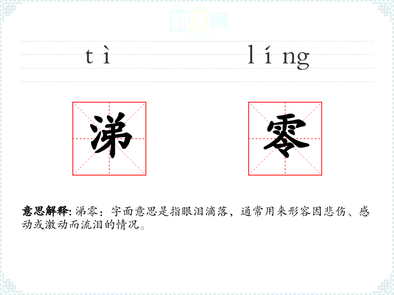 “涕零”一词源自古代汉语,其中“涕”指眼泪,“零”指落下。在古代文献中,如《诗经》中就有“涕零如雨”的描述,形象地表达了眼泪如雨般落下的情景。随着时间的推移,“涕零”逐渐固定为形容因情感激动而流泪的词汇。