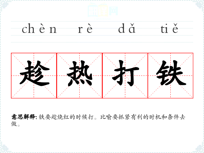 铁要趁烧红的时候打。比喻要抓紧有利的时机和条件去做。